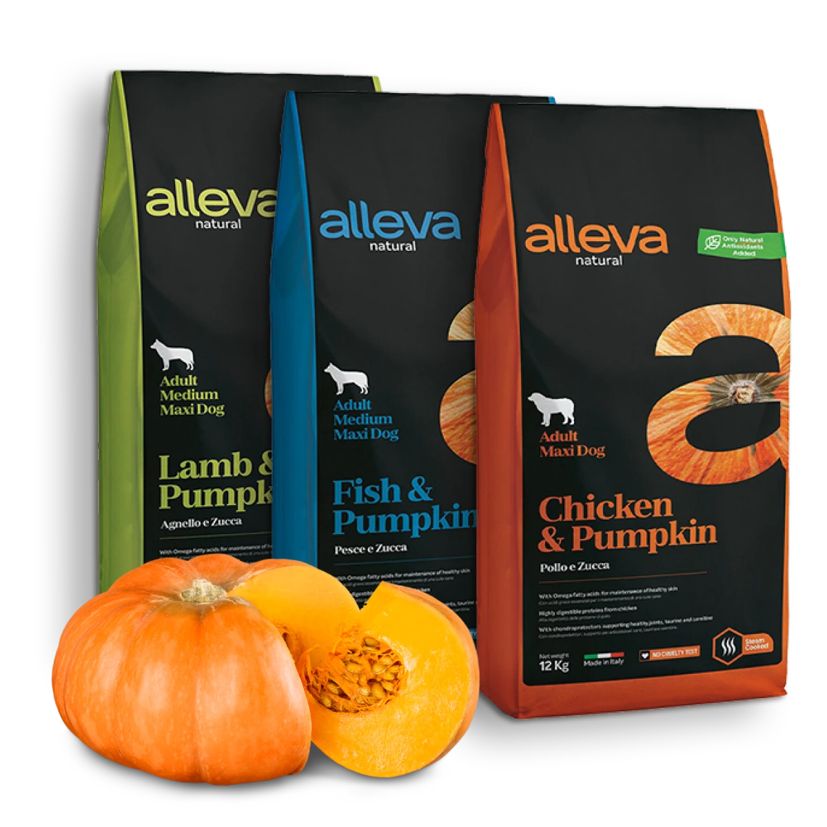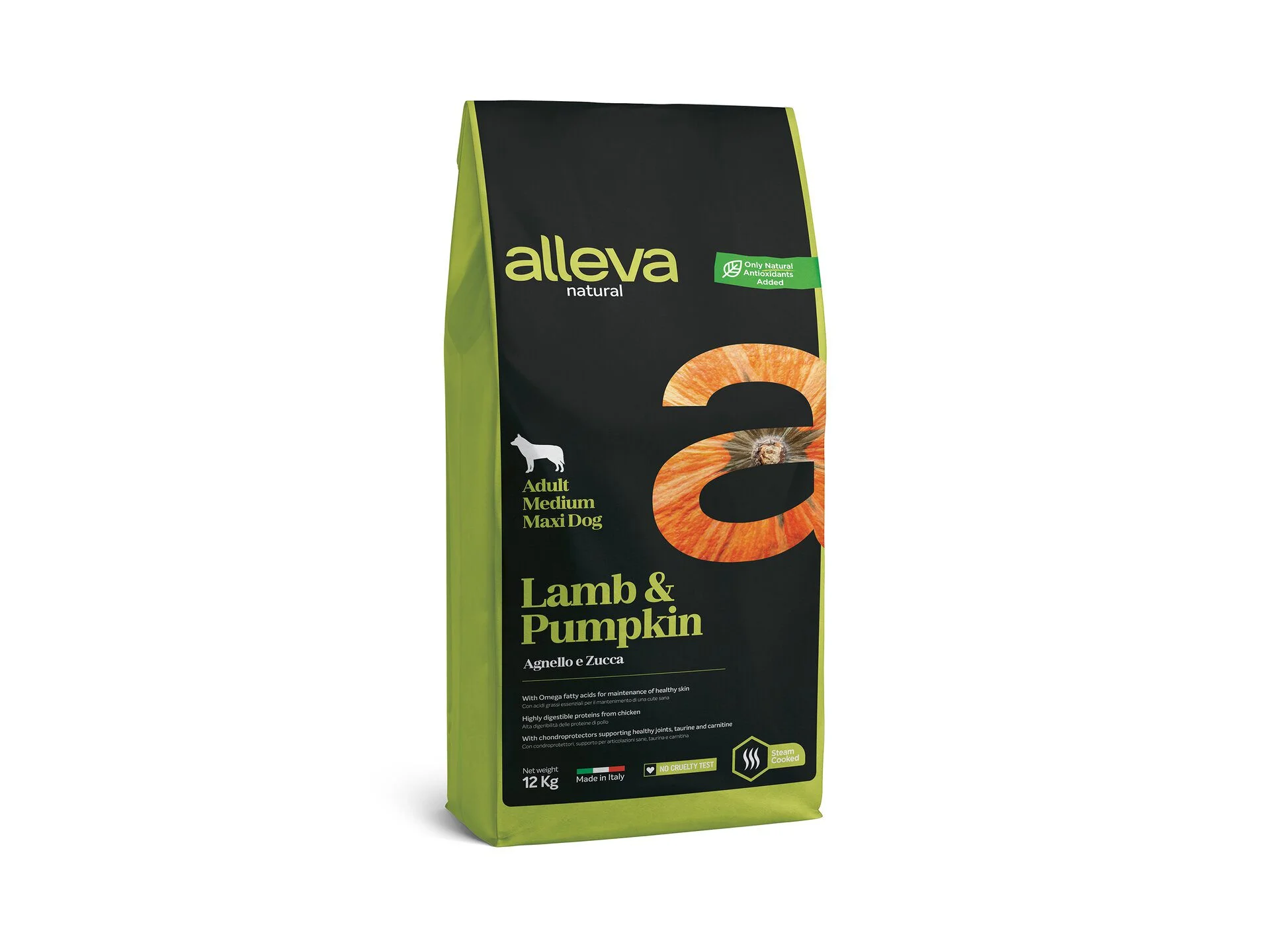 Alleva Natural, kuzu ve balkabağından oluşan düşük tahıllı formülüyle sindirimi kolay, sağlıklı ve dengeli bir beslenme sunar. 🌿